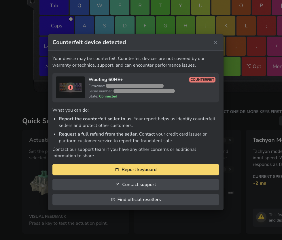Even if you don’t get the warning message in Wootility (if you're a Chinese customer), you might still have a fake Wooting PCBA, and get the warning message at a later stage.