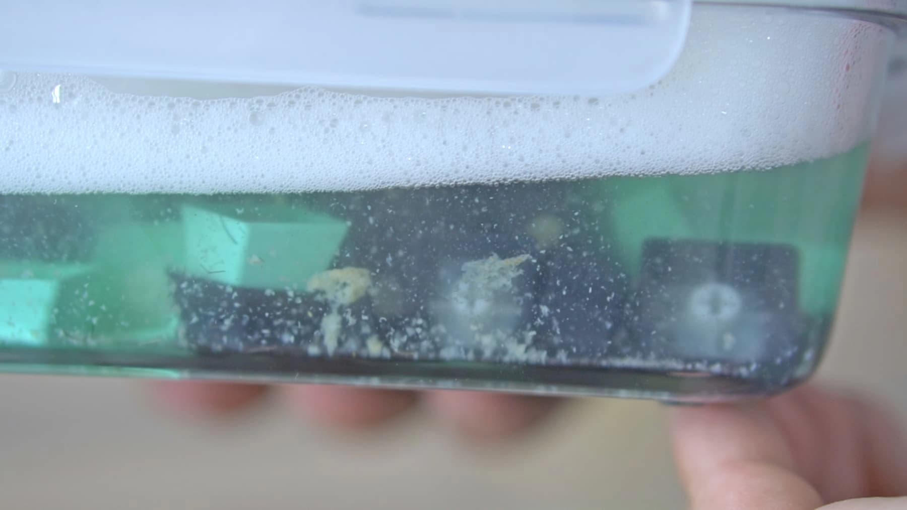 Don’t have a lid? You can also stir the keycaps instead of shaking it. After 30 minutes, you should notice a lot of debris floating in the water.