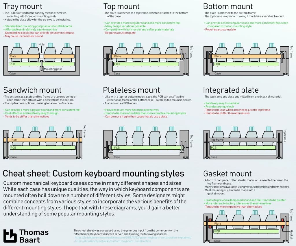 This is why the case assembly method plays an important role. There’s sandwich mount, tray mount, and gasket mount to name a few. When you look at major brand keyboards, these are screw-in mounts. The switch plate and PCBA is screwed on to the bottom case.