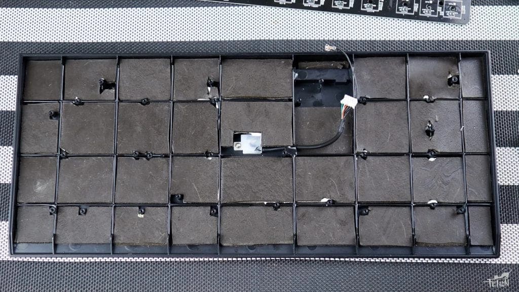 Now that the keycaps and the switches are taken care of, we need to make sure the case isn't functioning as an echo chamber. To do this, you'll need to disassemble the keyboard. Pack the empty voids below the circuit board with something that is fairly dense and preferably heavy, but that still absorbs sound waves and vibrations.