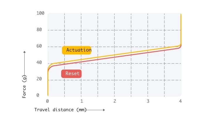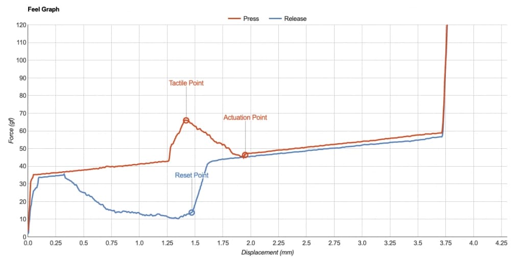 - Accumulated force: The sum total gram force required to press the key from start to end. This is useful when comparing non-linear switches.