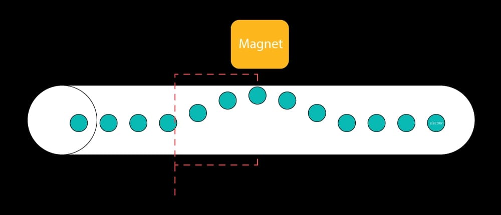 This magnetic field also pulls in or pushes away electrodes (electricity balls) in an electric current (a flow of electricity) causing a split of positive and negative electrodes. Which can be measured with another electric current connected on one side to the positive- and other side negative electrodes, creating a potential difference (a rate of electricity flowing from one to another point).