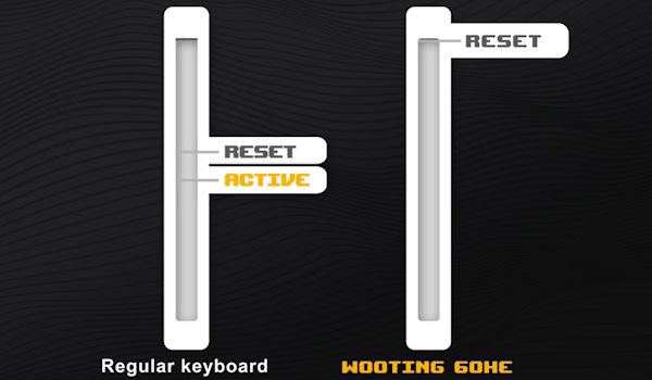 On an analog input keyboard, you can configure the actuation (ON) and reset (OFF) threshold on each or all keys. This is often called configurable or adjustable actuation point. Wooting’s Rapid trigger takes it a step further. It dynamically changes the actuation and reset threshold based on your press intention.