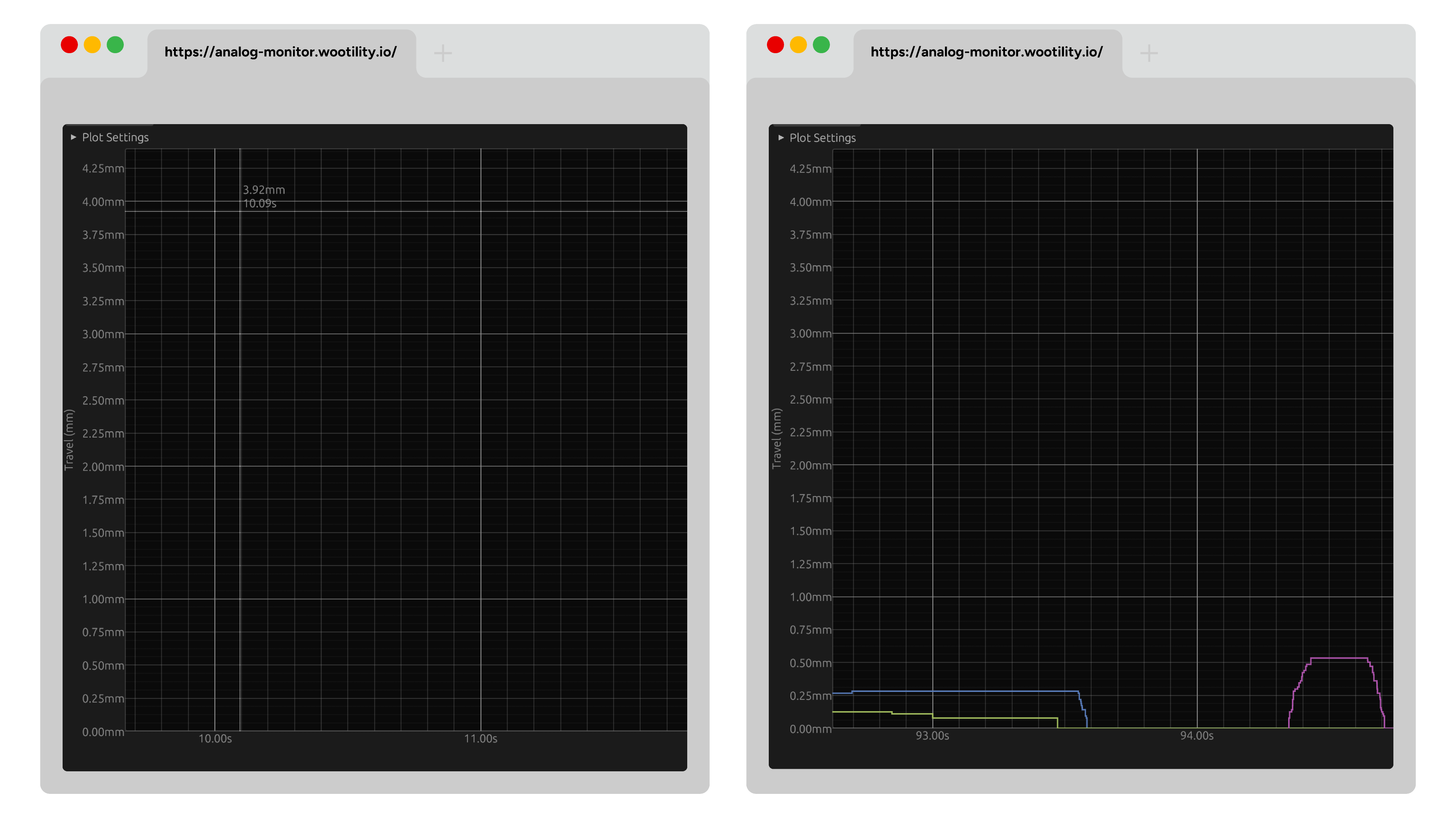 This is how it would look in the analog monitor. On the left side you see there's no activity. On the right side you do see activity (keys being activated).