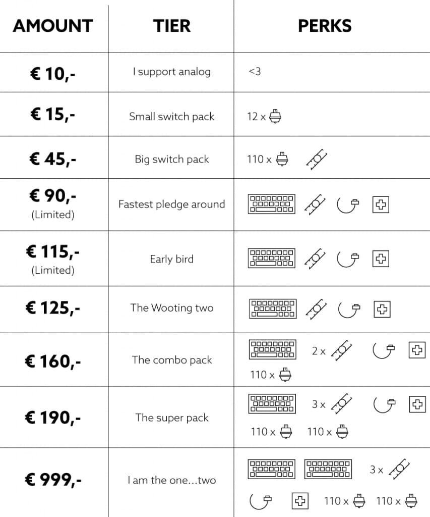 - Early bird is a Wooting two with all its accessories. But there's a limit to 200 backers.