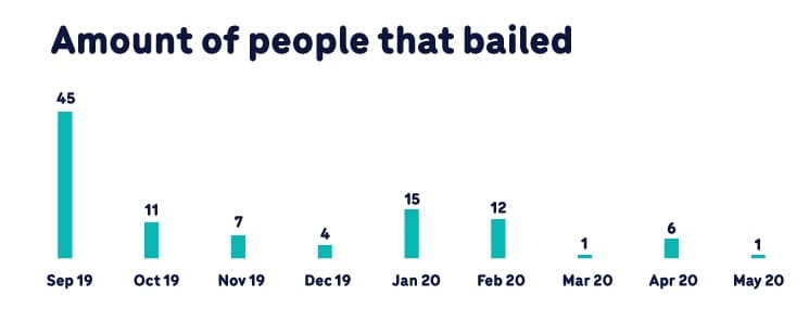 The backbone goes to show when you look at the number of people that bailed ship on the Wooting two Lekker Edition. This graph above shows the month in which a person that bailed had placed an order. If you add them to the sales graph from earlier, this would give you the total orders per month. This means that 45 of the 307 people in September had to jump ship.