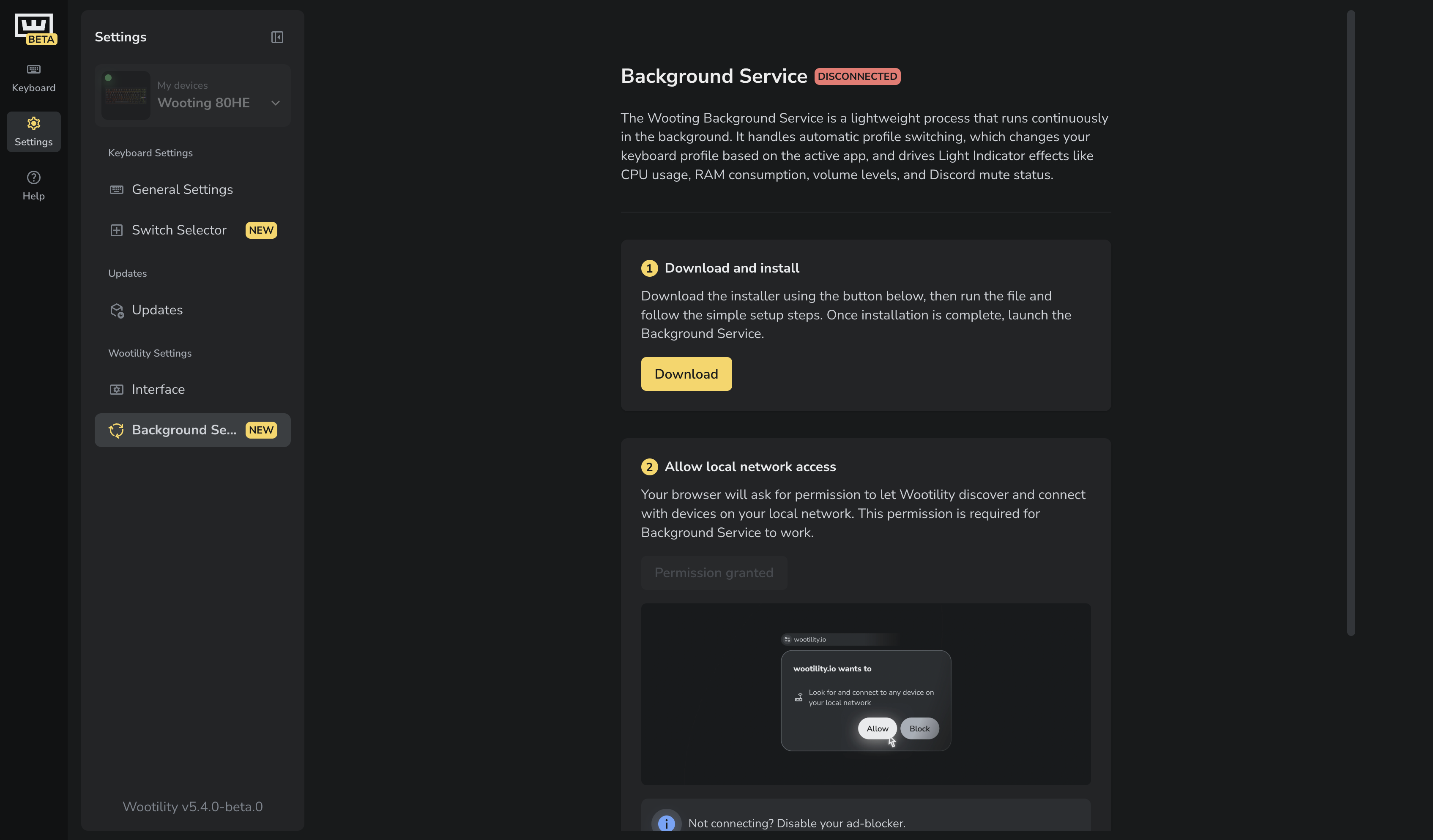 - Go to Settings → Background Service and install the beta version of Wooting Background Service. If you're using Wootility in a browser, grant the required permissions when prompted.