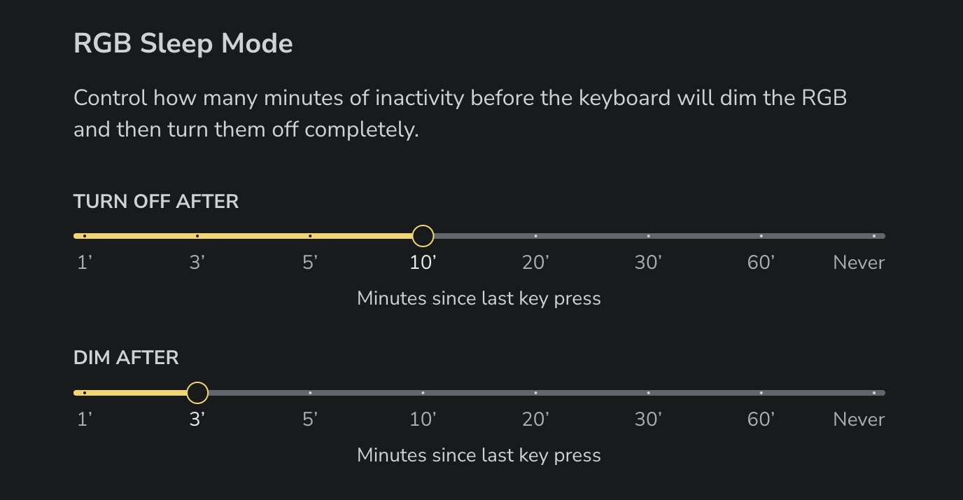 - Redesigned the RGB Sleep Mode controls. Pick from preset durations or set it to “Never” to keep RGB at all times.